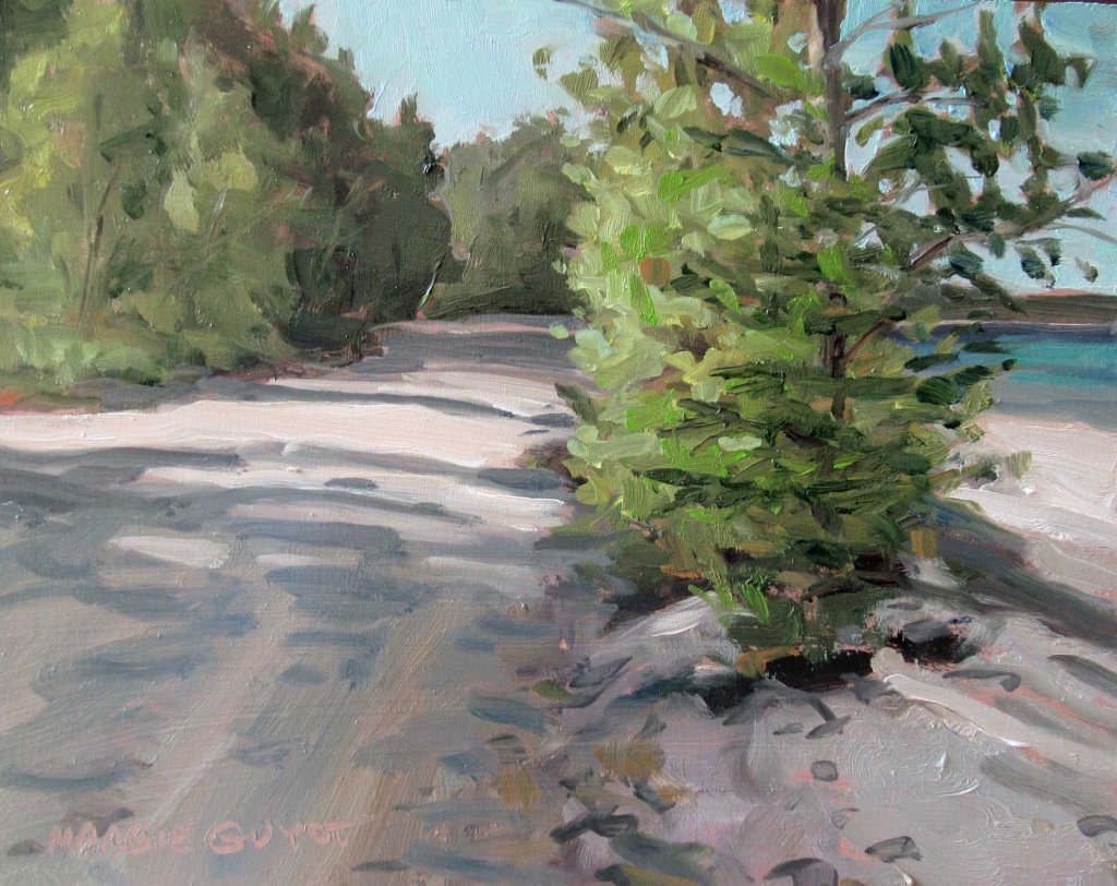 And finally here’s No. 3 of the day. This is way at the south end of the park. A favorite spot for people to come and splash around on the beach. I was glad I’d thrown my collapsible wagon into the truck. Lots of gear to get over the trail to this spot. The old French easel I’d bought (used) back in 1985 is perfect for this sandy spot. My 3 Soltek easels will probably remain in the studio for the rest of the summer. Sand clogs up their legs.