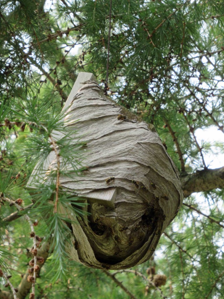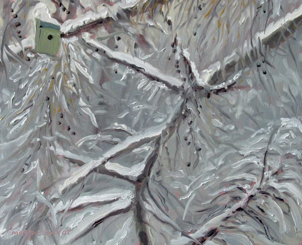 I looked out the window one blizzardy day last March and painted this view of a wren’s house. It was in the tamarack tree in front of my studio. It’d been hanging there for years, but no wren had ever used it. Then one day this past week I noticed a bunch of “bees” going in and out. Weird! Apparently they weren’t just bees, but hornets. This is how it looks after one week’s construction: