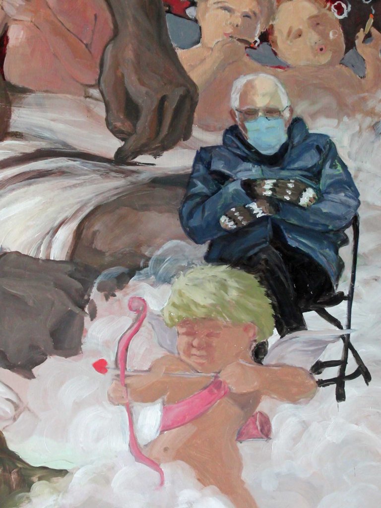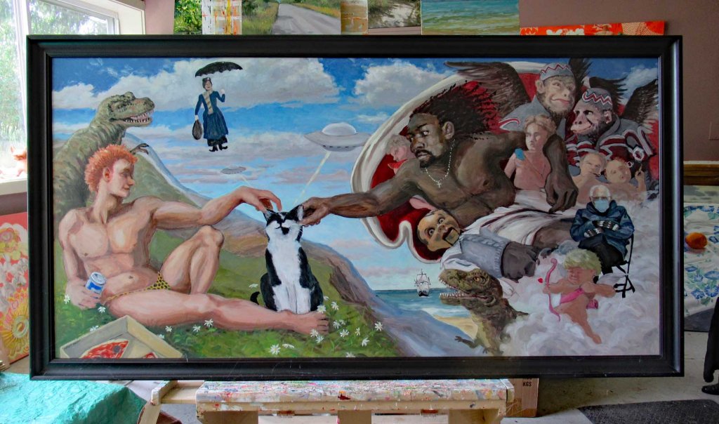 It got me to snorting and laughing and I just HAD to run out to the studio and doctor-up my version of The Creation of Adam. I wouldn’t be able to sleep tonight if I hadn’t done this. I painted over a green alien’s face.