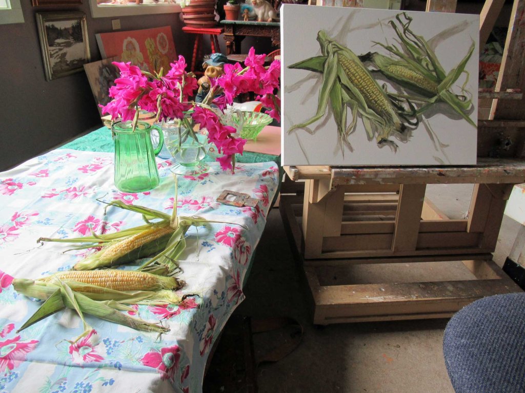 Corn’s been a favorite subject of mine. I’d bought a bagful a week ago, meaning to do an elaborite still life, with gladiolas and gloriosa daisies and…. But it turned out to be an unexpectedly busy week. “Ob-stackles” (as they’d say in that movie “O Brother, Where Art Thou?”). The gladiolas died, but the corn in the bag in the fridge still looks OK for painting. And since the clouds were threatening rain here, I decided to start a new – and small-ish – painting in the comfort of my studio.