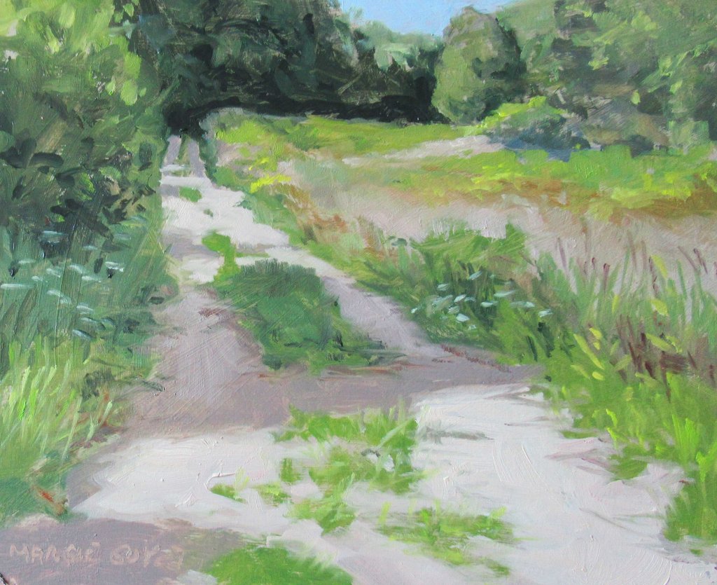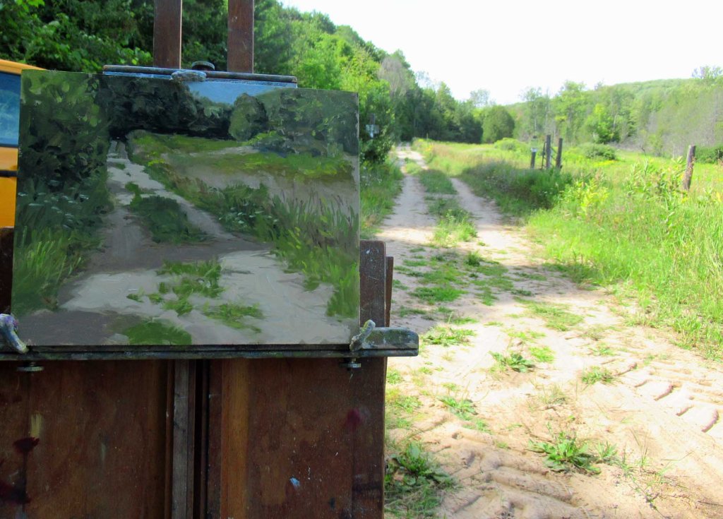 I had the itch to get out and paint yesterday afternoon. But where? I had to let Shooks Road rest for a little while and mosey on a bit east of there to another favorite seasonal road. I believe it was Toad Lake Road (or possibly Bennett Hill Road?) and boy — it’s not something for a touchy little, low-clearance sportscar! My Ranger handled it like a champ, bouncing over rocks and washouts. Around a big turn at the bottom of the hill I spied this little two-track and just had to paint it! While I painted, a big truck passed by 4 or 5 times. When I’d finished and was packing up, the driver (a woman) stopped and complimented me on the painting. An hour earlier it looked pretty horrid, but they generally do until about the last 15, 20 minutes when it all magically comes together. Turns out she owns the land and gave me permission to drive down the lane, where I came to a small bridge with a beautiful trout stream and a dead deer. Crows scolded something off in the distance as I left. Ah, August in the “outback”!
