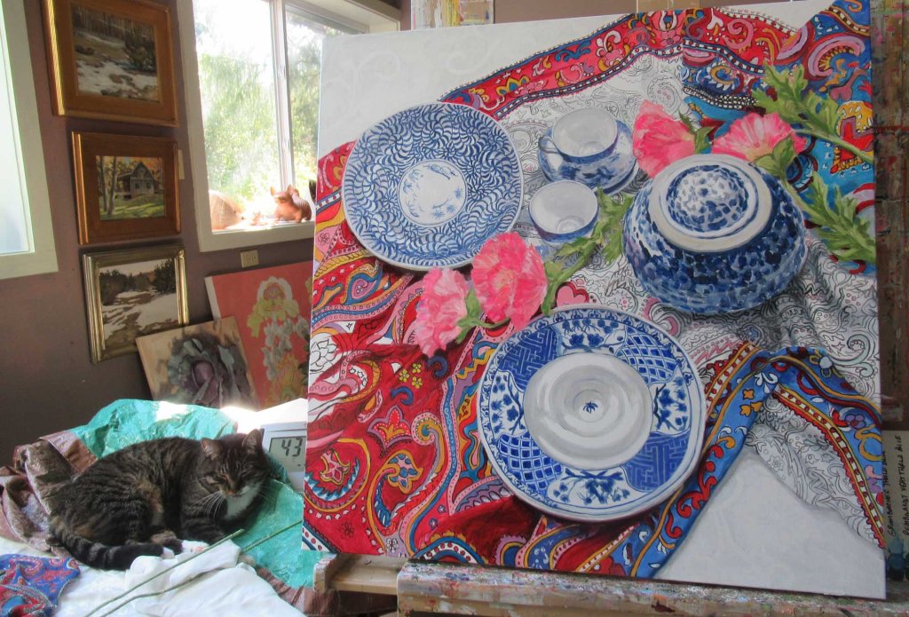 That’s Mr. Wonderful, keeping an eye on things here in the studio. Sometimes he sneaks over and rearranges things to his liking. Every time I walk into the studio he thinks it’s time for another treat (Temptations Catnip Bliss). Things have been crazy-busy (ugh!) but at least I managed to work on this for a few hours this afternoon. Stay tuned….