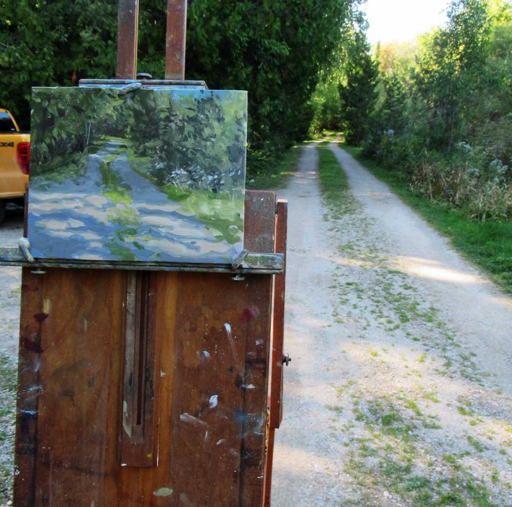 A day of yardwork. I kept watching the sky, waiting for the clouds to pass so I could go painting. It would clear up, but 10 minutes later it’d be totally cloud-covered again. I got a lot of yardwork done, at least! Finally around 4 PM it was all blue sky. I was sore and worn-out, but I grabbed my gear, had a Tylenol and took off down the road. N. Brinkers Road is only about 3 miles north of here, running parallel to Lake Michigan. There are some beautiful lakeside cottages on that road. Luckily there is also very little traffic. I brazenly sat my easel up in the middle of the road and painted away. You never notice how quickly shadows move until you try to paint them!