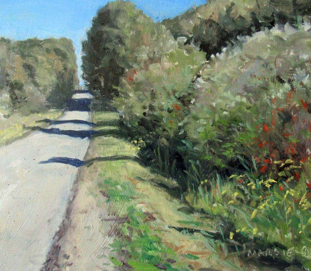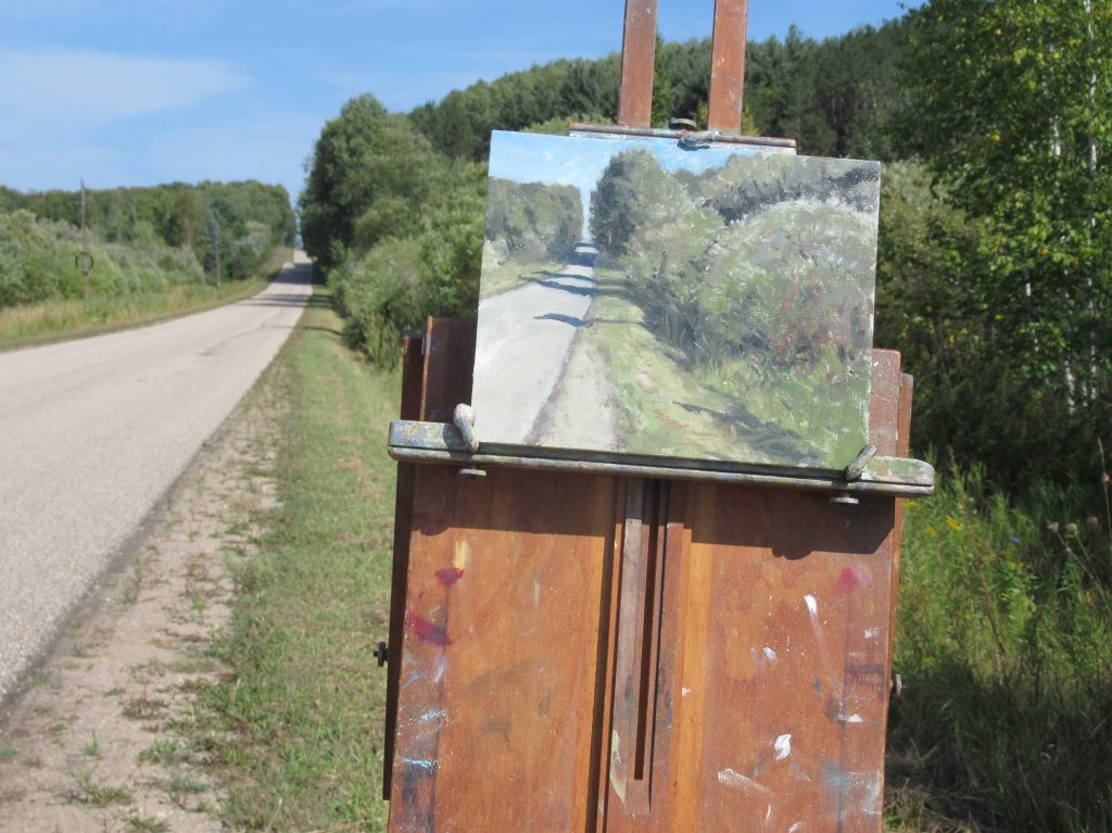 Another gorgeous day here in northern Michigan! This is right before the big Fall color change. Goldenrod and queene anne’s lace are blooming like mad. Wild asters along the road are covered in bees. Hummingbirds have flown the coop. Miles Road runs for miles (ha ha! Sorry — couldn’t resist!), going north and south off Essex/East Jordan Road. Only one truck passed as I painted. A little fruit stand behind me had a “Free — help yourself!” sign, so I took some jalepenos. I painted this in late morning, catching the long shadows across the road. To the right is a ridge covered with pines and maples. In the foreground there are a lot of maples and some kind of swamp-type willow that is covered with catkins in the spring. Every year I promise myself to do a painting with those “swamp pussywillows” but haven’t done it yet. Maybe next year?