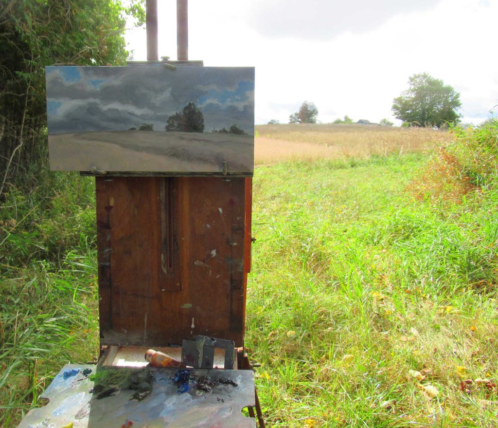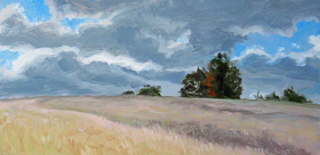 Yeah, those doggone clouds! I’m addicted to trying to paint the buggers. Especially lately. It’s kind of like trying to walk a tightrope, painting realistic clouds while they’re moving so fast. And ready to dump rain at any moment. Notice the tinge of red in the distant maple tree? We’re just starting to see fall colors here this week.