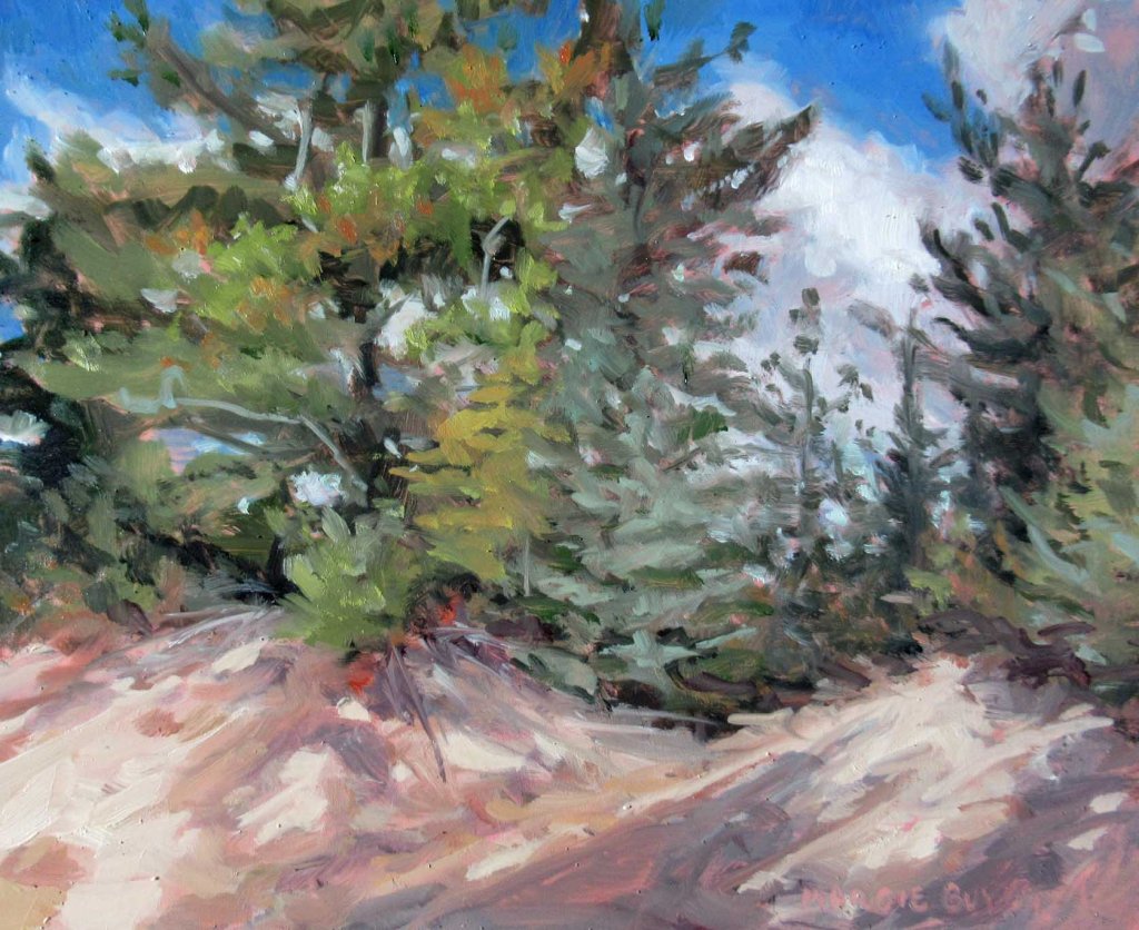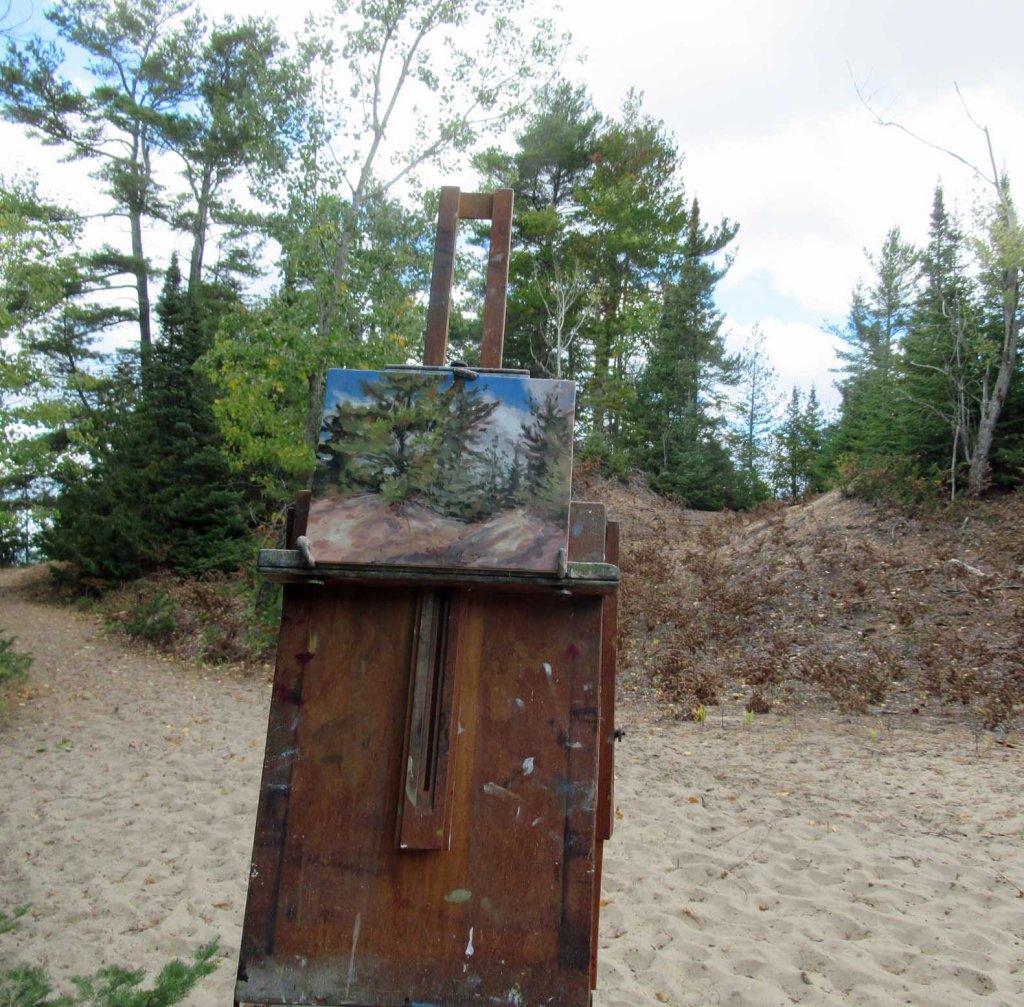 It’s a bit of a haul to lug painting gear down to this spot at Antrim County Nature Area. I set things down and took a little gander at the beach, but oy vey! That wind was just roaring! Waves were crashing! Nobody else was there. I was the only fool to go down there yesterday afternoon, But it was such a pretty day! Big storm clouds scudding by, occasional flashes of blue sky. How could a painter resist? I set up in a favorite spot: behind a dune that sheltered me from the howling, shrieking (!) winds. Ach — and here I am, complaining — and it’s not even winter yet! So — stay tuned for more….
