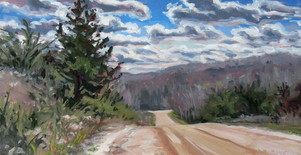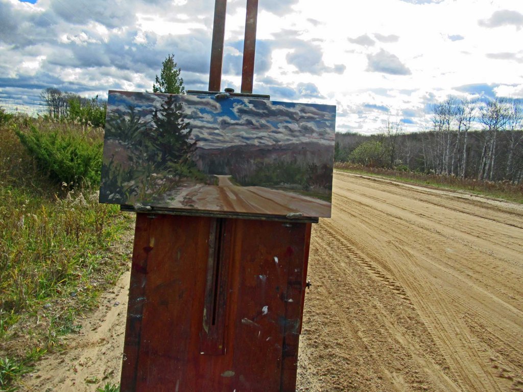 …Or maybe you’d call it a “ferocious” sky? I was just so excited to try to paint those clouds! The sky over Eastport today was a clear blue, but over towards Ellsworth and East Jordan it looked amazing. I’d had to run a few errands in that direction and had my painting gear along. I turned north off Ellsworth/East Jordan road onto the infamous Slough Road. Don’t let Slough Road fool you — only about the first 1/4 mile is paved. After that it can turn into the most horrible quagmire! I’ve nearly become stranded there more than once. Thank goodness for 4WD Low! But today the road had been freshly graded and was remarkably dry. I love that road, of course! There are some quite beautiful spots along the way.