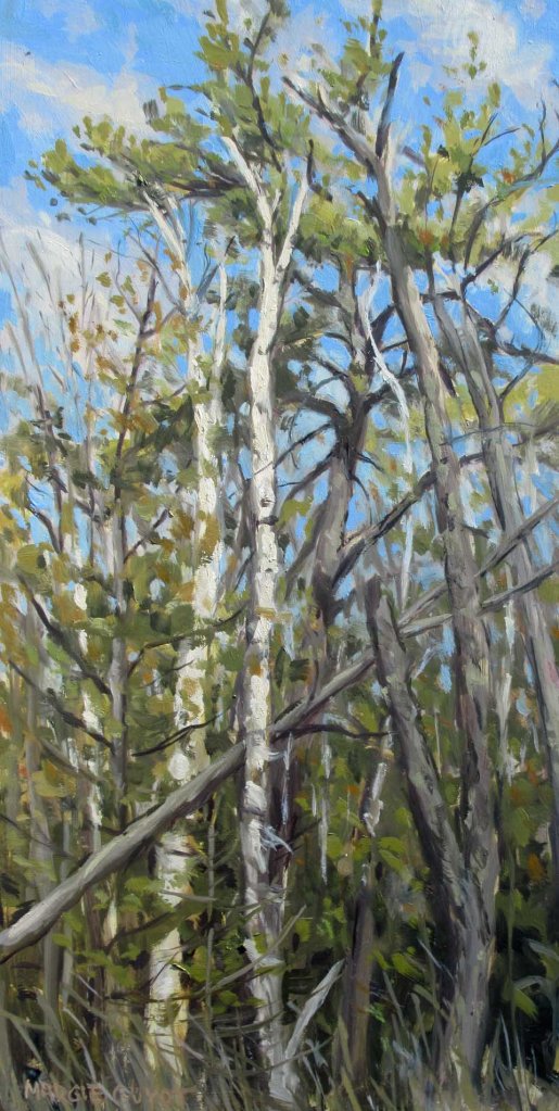 “White Pine & Birches” — plein air field study in oil on birch panel 16×8″ by Margie Guyot