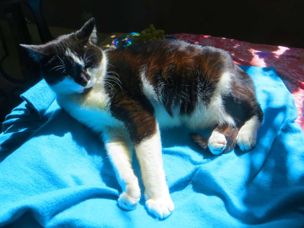 It was 38 degrees, rather breezy and I was standing in the shade. So I was glad to finish this one! Chilled to the bone. Instead of staying out & painting more, I went straight home and had a hot mug of tea on the porch, sitting in the sun with my favorite cat on my lap. A good way to thaw out! Picasso is my little nurse. And here’s my setup: