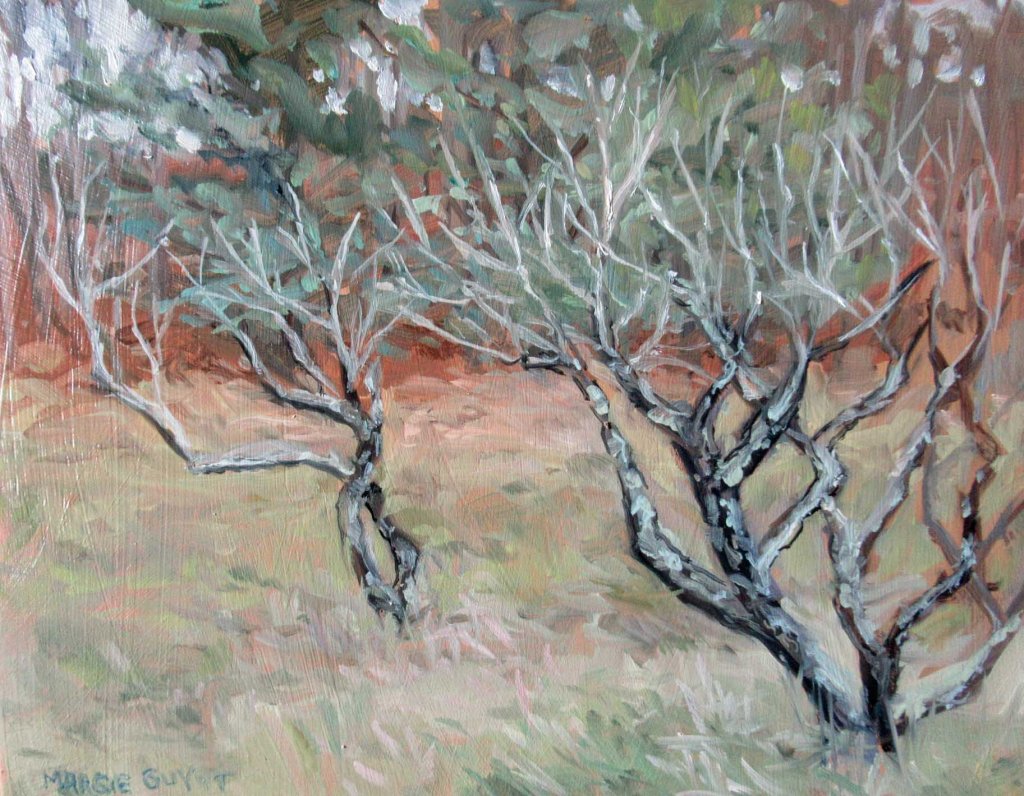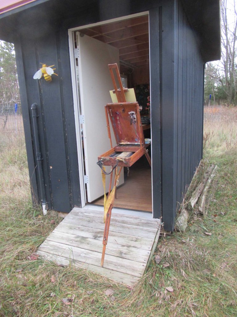 If you’ve been following my blog lately, I’m sure you’re sick and tired of hearing me whining about “days and WEEKS of cloudy skies”. Today was more of the same. I finally reached the point this afternoon where I thought I’d just go bat-shit crazy if I didn’t get out to paint. But, being a Moon-child, I didn’t want to have to GO anywhere. I love staying right here, at home. So I strolled around this afternoon, looking for something to paint. I thought this view of my plum trees might be sort of interesting, composition-wise. And did I mention it’s a tad chilly lately? I got the bright idea of setting up my easel in the doorway of the potting shed. At least I’d be shielded from icy blasts.