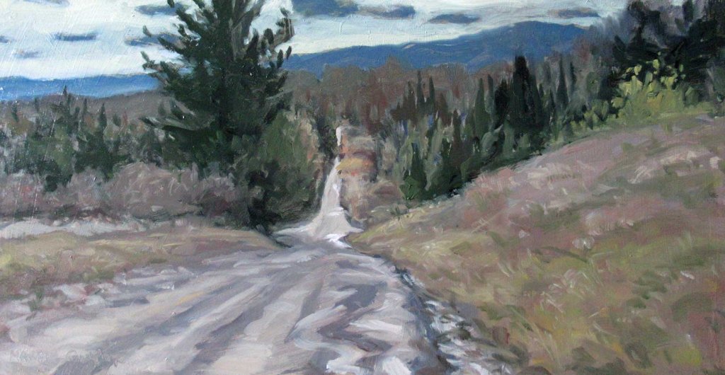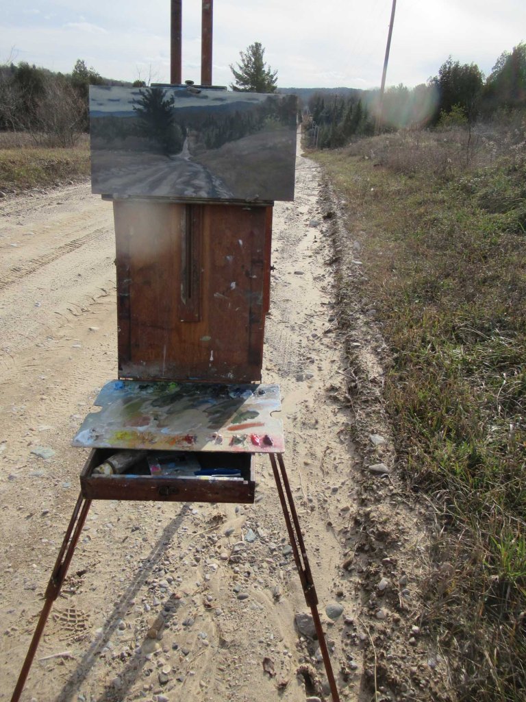 This morning I saw 2 sun dogs (see note below) in the sky and it got me so excited I could hardly stand it! How could I NOT go out painting? Especially since snow’s forecast for this area. But alas, I didn’t paint the sun dogs. Instead, I painted 2 other views of “late fall in northern Michigan”. This first view I’d painted several times over the years, but it’s been a while. One of my favorite spots, Mitchell Road runs south, off Bennett Hill Road. This section is a seasonal road (not plowed in the winter). Down at the bottom of the hill you can see bits of water sparkling in the sun. There it turns into quite a quagmire at times. I really loved the blue of the distant hills and the dark scraps of clouds scudding by.