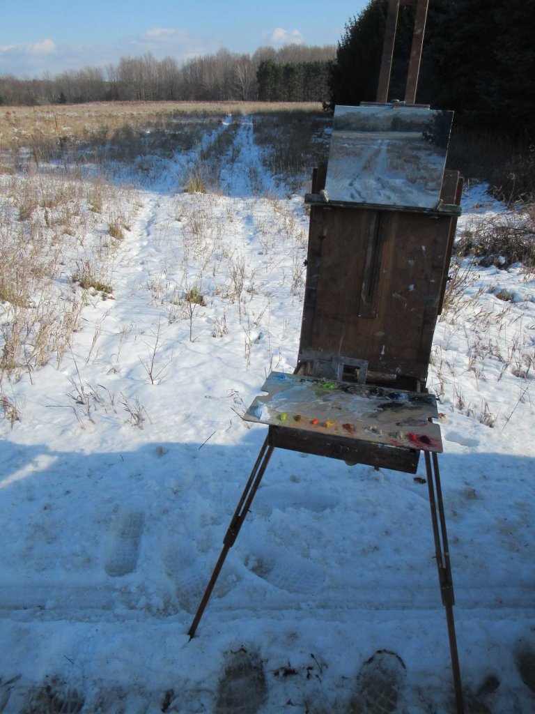 It was almost summer-like today: up to 40 degrees and periods of sunshine! Of course I had to get out and paint something. This is a field on Farrel Road, just north of M88, east of Eastport. It was a bit of a challenge (well, they ALL are!) — As soon as I sketched in the composition, the clouds rolled back and I lost the colors and patterns of sunlight and shadow. Darn! Seemed like every time I’d be bent over, washing out my brush, the sunshine would pop back in, only to disappear as soon as I’d loaded my brush up with “sunshine color” (white with a teeny dab of yellow ochre). And the cloud cover gave a more grayish tone to the shadows. When the sky cleared, the shadows became bluer. Maybe when this is dry I might try giving the shadows a touch of a blue wash.
