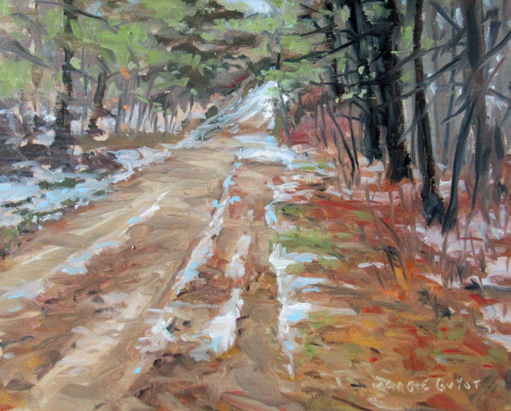 Beadle Road — whenever I hear that name I hear Laugh-In’s Lily Tomlin (the phone operator) snorting and giggling, giving Mr. Beadle a hard time. This is another seasonal road. Not plowed in the winter. The 6″ snowfall we had earlier this week was melting in the 40 degrees this morning. I thought it was pretty enough to paint.