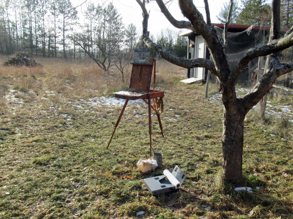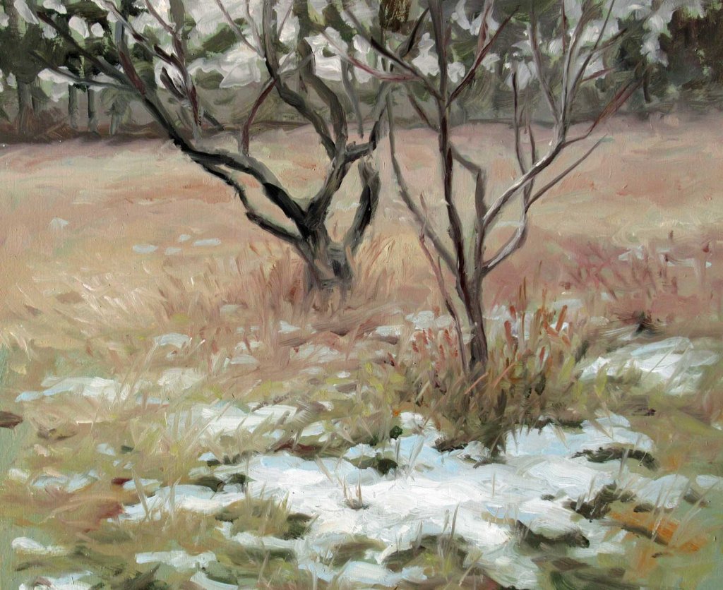 The sky was relatively sunny early this morning, so I took a walk around the orchard, looking for something to paint. Overcast skies were predicted, so there was no time for dilly-dallying. The field of dried grasses varied from soft pinkish shades to warmer strawlike colors. And I thought the bits of remaining snow were rather interesting.