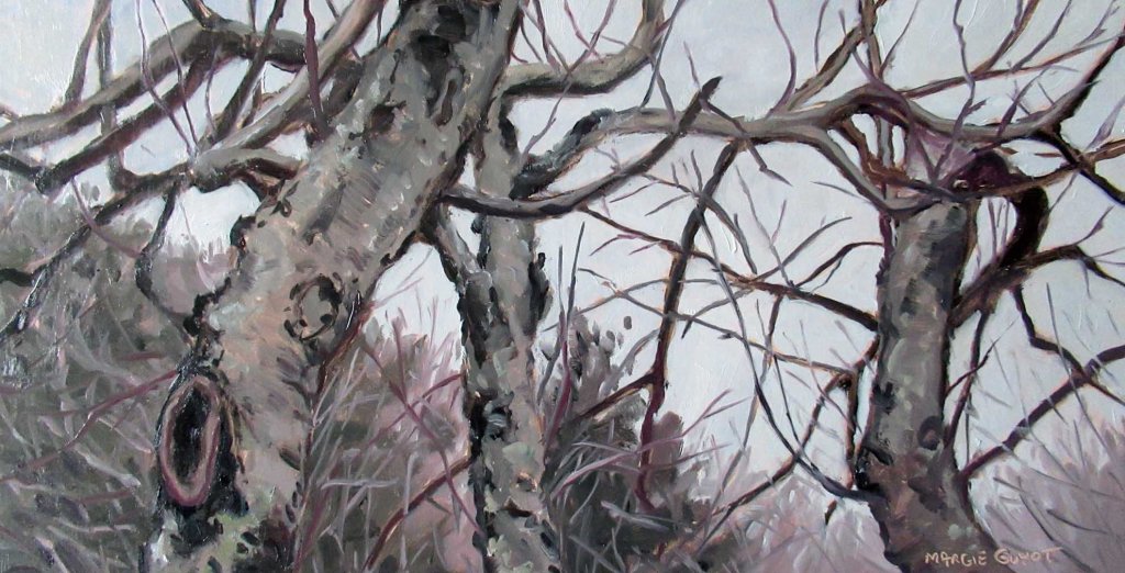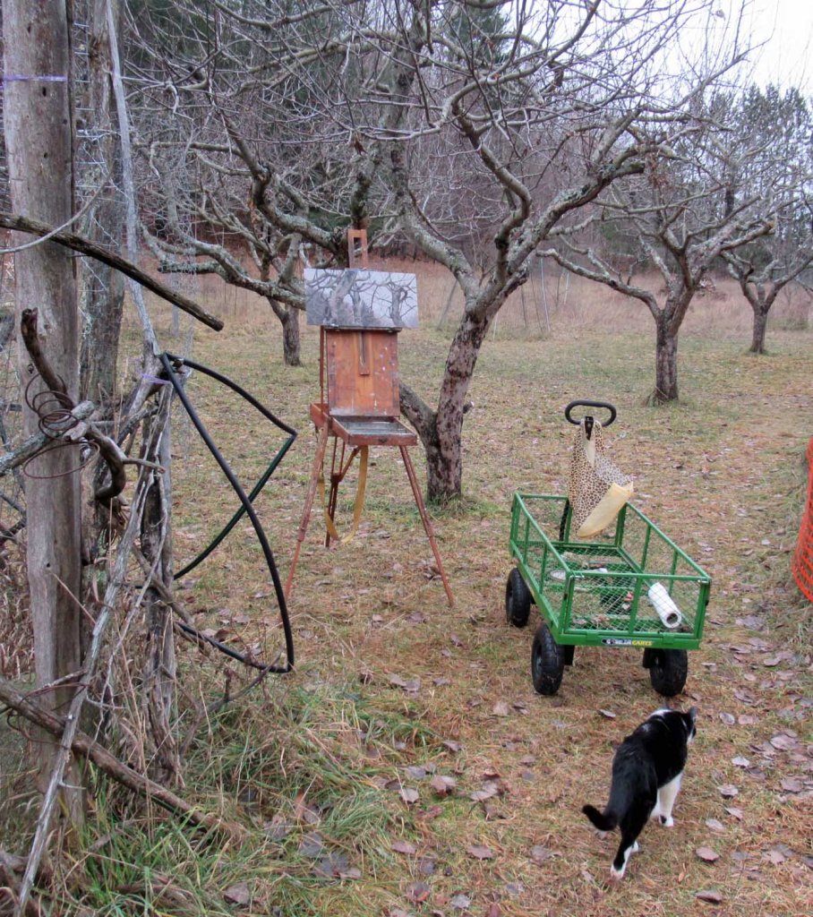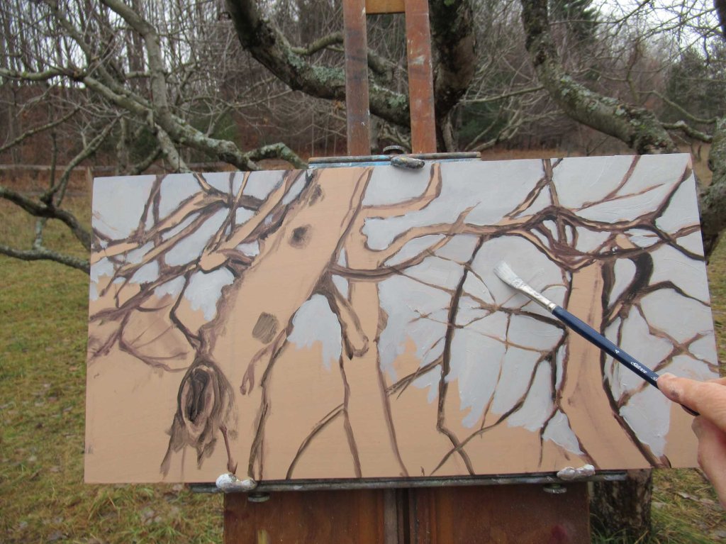 Another dark, cloudy day here — but at least it wasn’t raining or snowing. Actually, it was kind of warm: about 47 here in Eastport. I had this burning lust in my heart (!) to paint something — oh, but what? On top of it, I just wanted to stay home. I’m a homebody. Was there anything at all amazing here? When I went out out to feed the possums, I stopped to look around in the apple orchard. Ah– the trees! So bizarre! Abstract, yet realistic. Can’t beat that combination! I dragged my gear out to give it a try. Drawing it in was a bit of a challenge, but challenges are what make the world go round. I get bored easily.