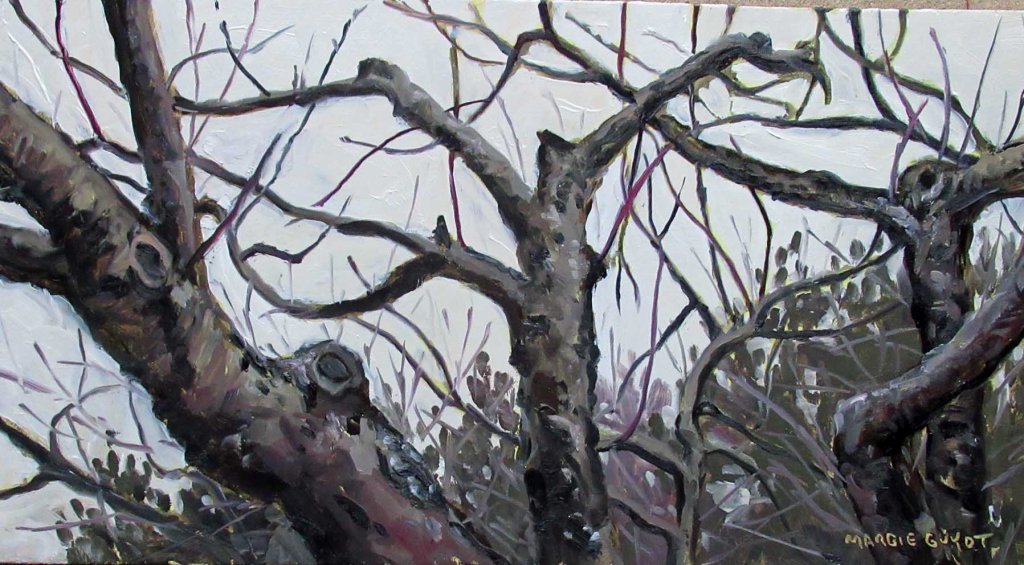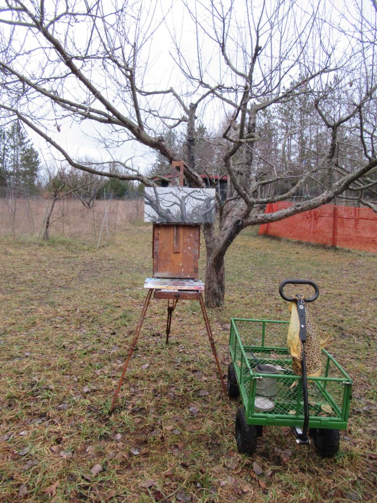 It was chilly and dark. Rain chased me in at one point. But still — it was far more enjoyable than going shopping at the Mall! Two of my cats were out there with me at the start. Then they started meowing and demanding I take them into the house. This was just 10 minutes before the rain started! How did they know? I came in, had a cup of tea and meditated (and fell asleep). Later, I went back out and managed to finish this — another view of my little apple orchard.