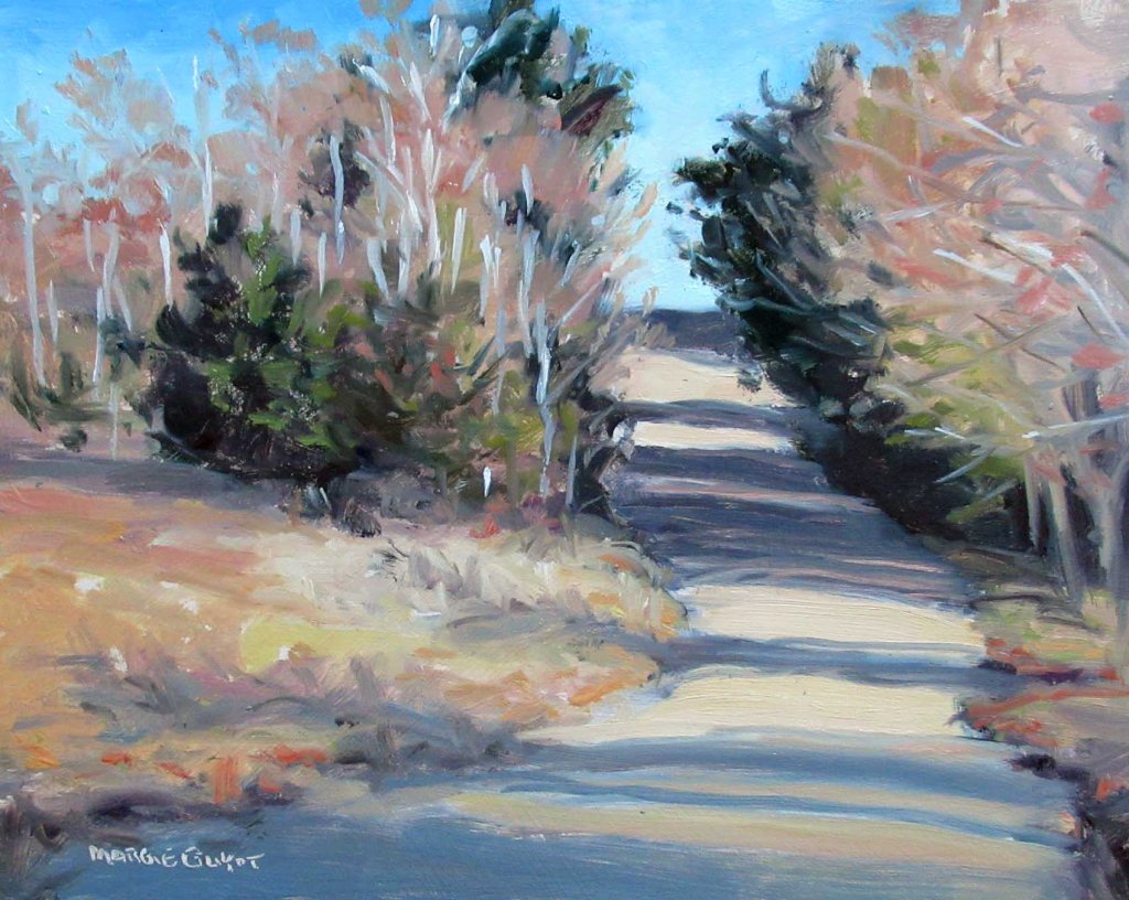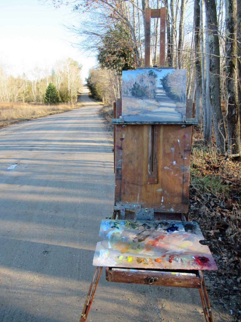 After weeks and weeks of the most depressingly-gray skies, a clear blue sky opened up this afternoon, shocking us all. I’m still recovering from the flu – ugh! – but how could I possibly not get out there and crank out at least one painting? I somehow ended up on Bennett Road (yes, again!) and stood in the chilly shade to paint this. And all my brushes were so horribly frayed. Excuses, excuses!