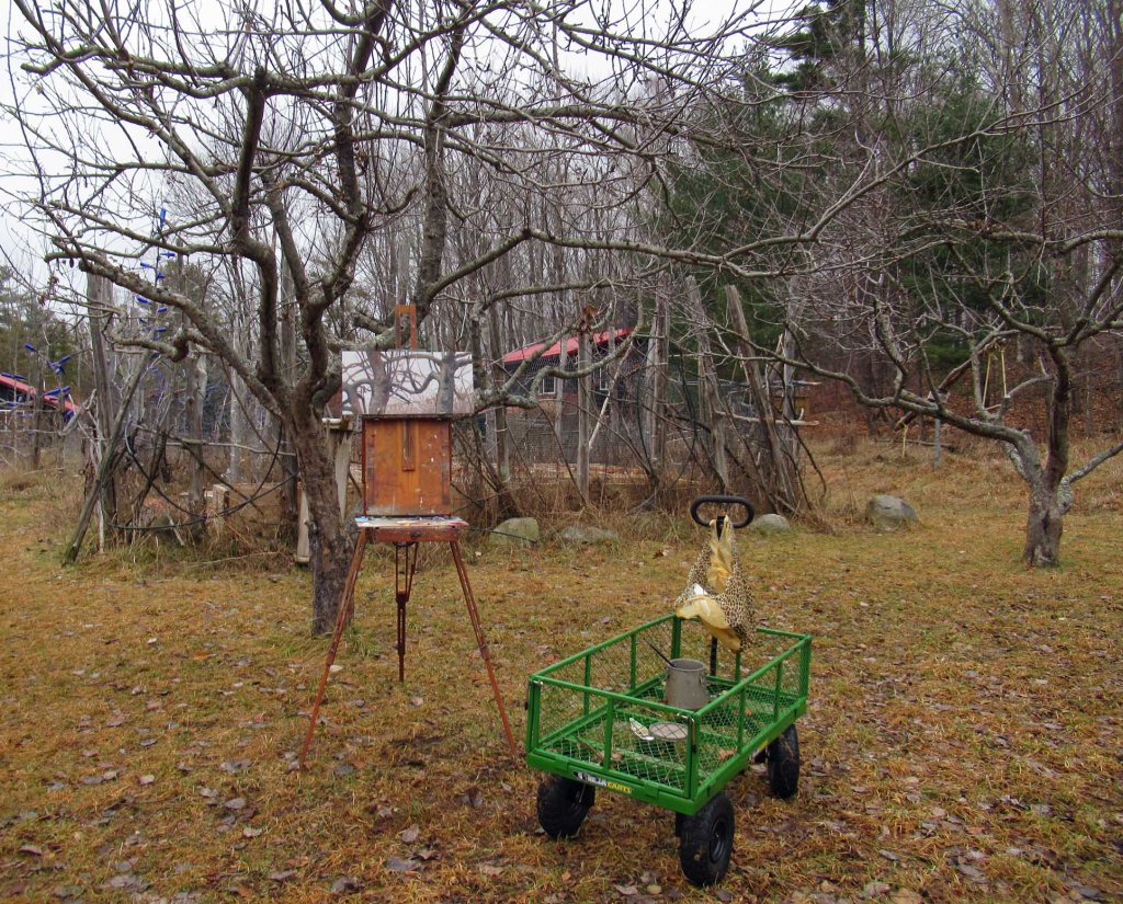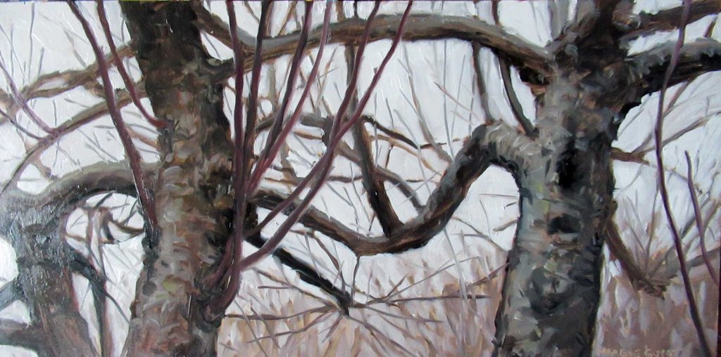 The forecast was for a mix of rain and snow, but I was in the mood to get out and paint. I thought for sure I’d be making a hasty retreat at some point, but the wet stuff held off. Yeaaaay! I love this view. Every day as I walk through the apple orchard on the way out to feeding the resident possum – he/she lives under the potting shed – I look up through the branches. Ahhh – so wild! So abstract! This is the third painting I’ve done on this theme so far. There will be more….