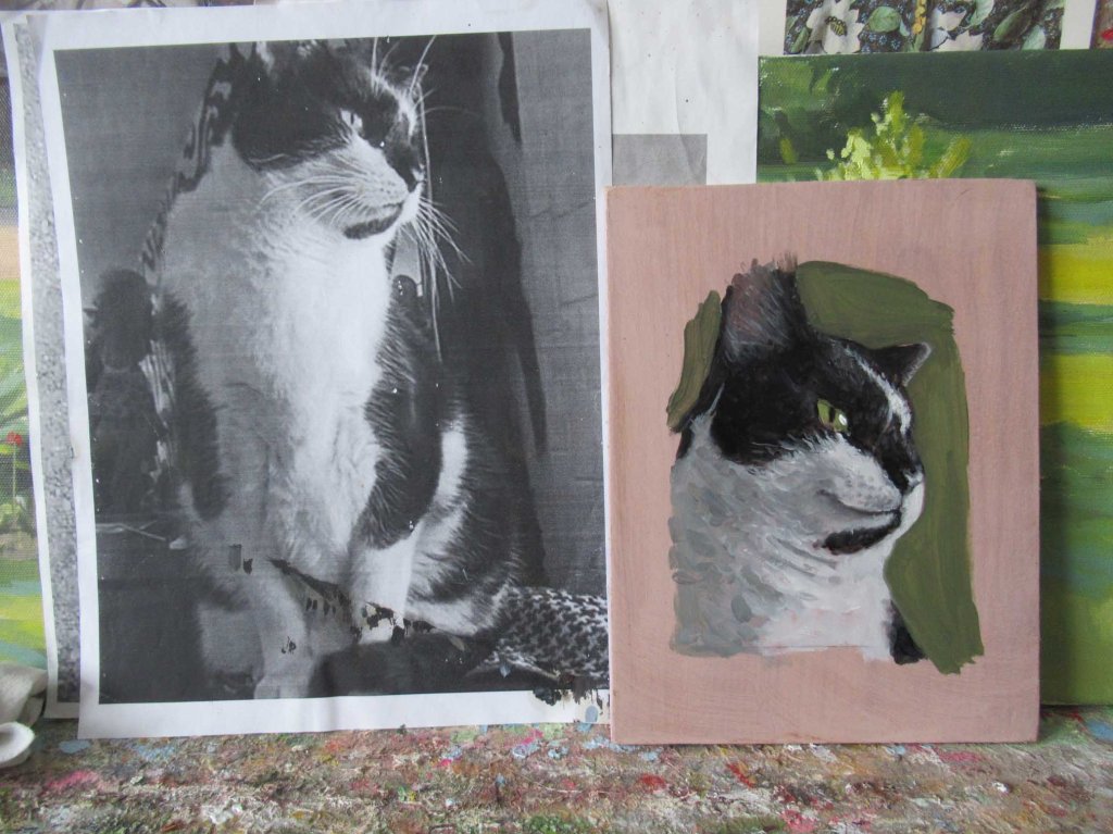 Picasso’s wonderful and smart, but he refuses to pose. So I have to use a photo. I stopped at this point to let it dry a little before I add his whiskers. Whiskers are tricky! You need the perfect, tiny brush, the perfect mix of paint and the perfect wrist movement. So maybe tomorrow I’ll have this all finished and framed.