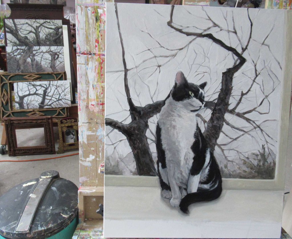 As soon as I walked into the studio this morning I could see what was wrong: the cat’s body was too large for his head. I spent a couple hours to re-drew it. I’ll have to wait until tomorrow to put in his whiskers and fine hairs. Meanwhile, I started painting in some of the background trees, using some of my plein air studies for a reference. Picasso, the cat, still won’t pose for me. Stubborn boy! Had to use a photo.
