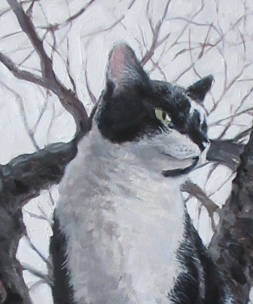 Robert Bateman, the great wildlife artist, taught us a lesson about white snow. He said he’d painted a snow scene with deer footprints but somehow it didn’t look right. So he want outside and looked. Sure enough, the dark foot prints were wrong! What he realized was that the flat surface of the snow was reflecting the blue sky, turning it a rather light/medium grayish blue value. But the deer tracks were a bright, warm white. Why was that? In winter, the sun is at a lower angle and its rays were hitting the deer footprints at a 90 degree angle, head-on. So when I went to paint the white of my cat, I visited the orchard to compare the white snow on the branches to the white of the sky. Surprise, surprise! The sky was “whiter” than the snow.