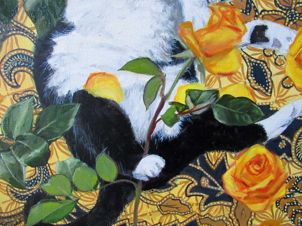 Here’s a closeup of the rose stems & leaves I painted today. Good thing I bought more roses yesterday. The ones I’d been using were brown and crispy. The new ones are pink, but that’s OK — the leaves look pretty much the same. I hope to finish this painting tomorrow so I can start on a new one with the pink roses.