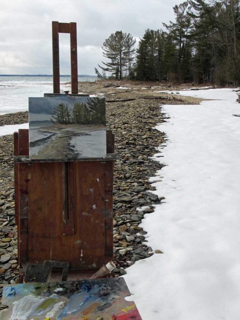The sun came out for about 15 minutes today and I thought I’d go over to a friend’s getaway on Grand Travese Bay and paint a view of their cottage. I’d wanted to paint it surrounded by snow, since it’s a dark buiilding. But all the snow had melted in their yard! Alas, I grabbed my gear and walked down to the lake. Voila!
