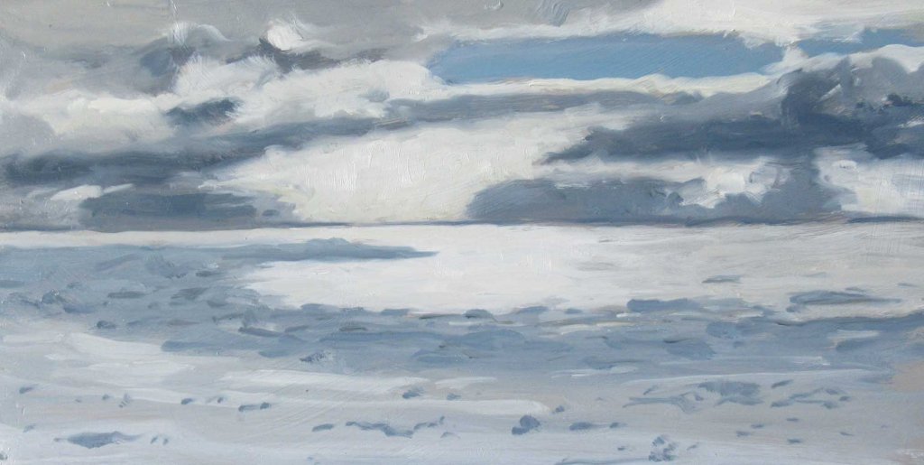 But wait! There’s MORE! The most interesting view (to me, anyway) was looking directly west, out over Grand Traverse Bay. Big clouds were rolling over, occasionally dropping snowflakes on me. I loved the view! But it was a real challenge to paint — the clouds were constantly changing and moving. I painted as fast as I possibly could. I was bound and determined to try and paint it, though. It was a balmy 34 degrees and only a light breeze. Usually I feel like a frozen popsicle after painting down at the lake.