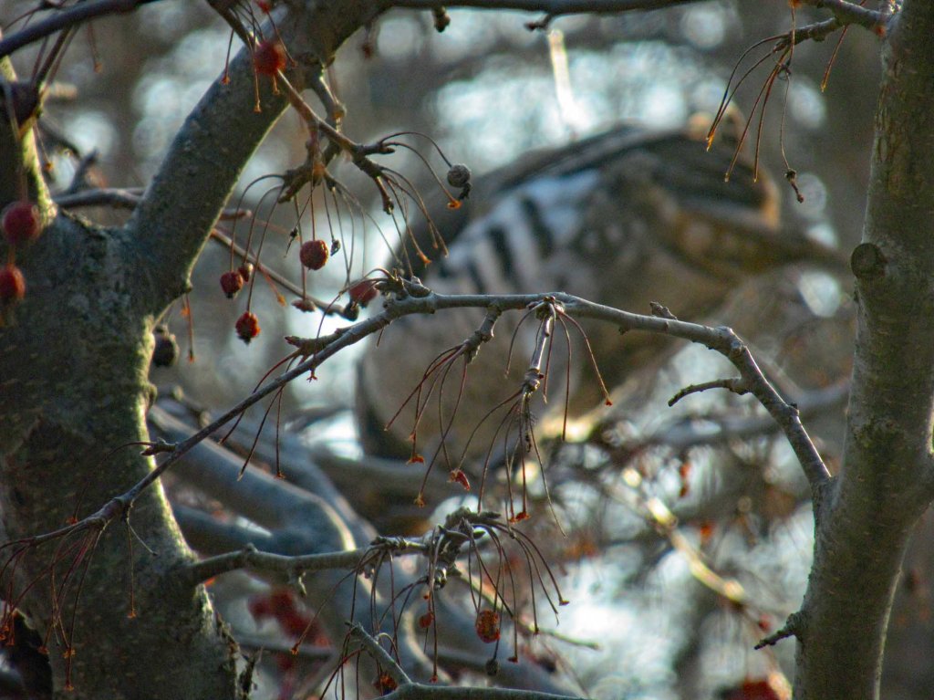 Then a motion outside the window caught my eye. It was a male ruffed grouse, eating crabapples! Sorry the photo isn’t that sharp. My little point-and-shoot camera didn’t want to focus. I’m hoping I get some wild turkey out there in the tree again. Keep yer fingers crossed!