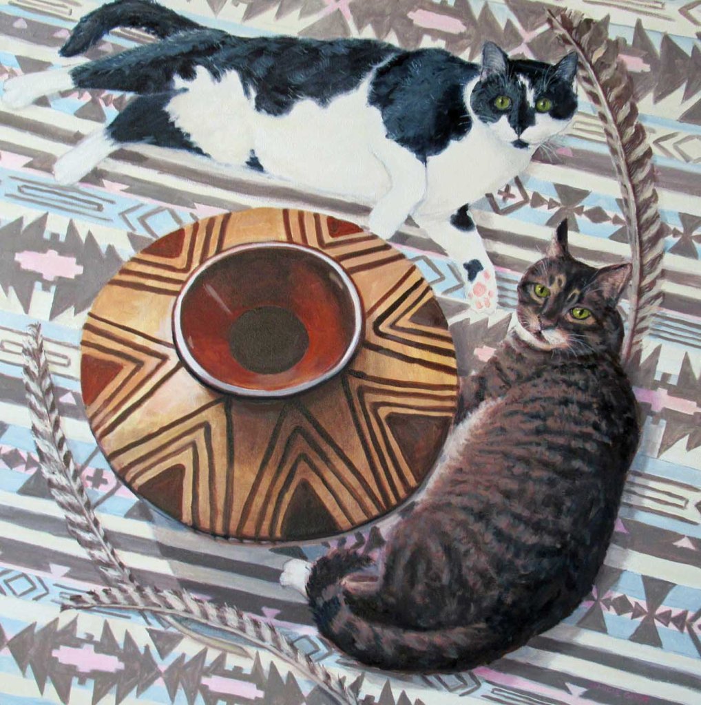 I’m calling this “done”. The turkey feathers were a last-minute, snap decision. I came back from the Post Office this afternoon, looked at it and thought what the hell.... The pot was from an antique store in Elk Rapids. At first I thought I’d pair it with ears of corn later this summer. But that’s just too “expected”. Robert Bateman, the great wildlife artist, told our class to try to paint something nobody’s seen before. Avoid the trite. So instead of corn, I used two of my wonderful cats: Picasso (the tuxedo on top) and Mr. Wonderful (the mackerel tabby on the right). And that fabric was almost enough to give me nightmares! So — we’ll see what next week brings….