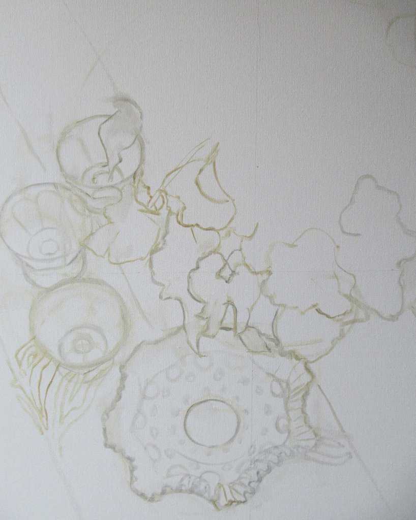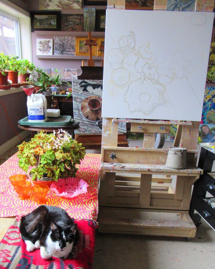 That’s my dear Picasso in his favorite spot, keeping an eye on his mommy. For weeks I’ve hunted for cut daffodils in the stores but haven’t been able to find any. Last week I saw some but they were brown and wrinkled. Ach! I’d spent days (weeks!) doing grunt-work: painting sides of paintings, sanding and shellacking wood panels, re-hanging paintings. Every day I’d hope to see blue sky, so I could go out and do a landscape, but it’s been blah-gray for ages. This morning I wandered around in the swamp, hoping for a spark of inspiration, but I just couldn’t bring myself to paint another dried-grass painting. So I decided to do another painting with this amazing begonia from my friend Lucy. Before it croaks.