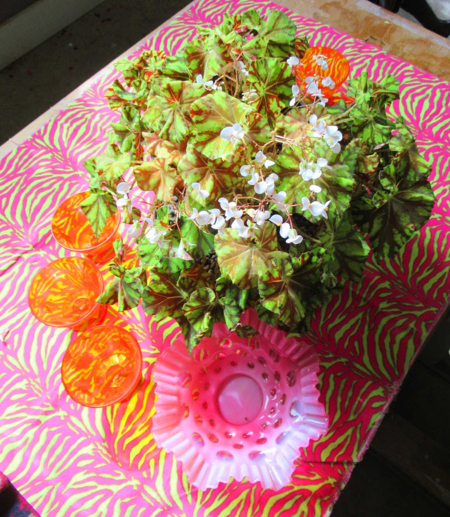 Starved for color, I paired it with a psychedelic-colored cloth and screaming orange dessert dishes. And an old favorite: a polka-dot, ruffly glass bowl. Here’s what I was looking down at: