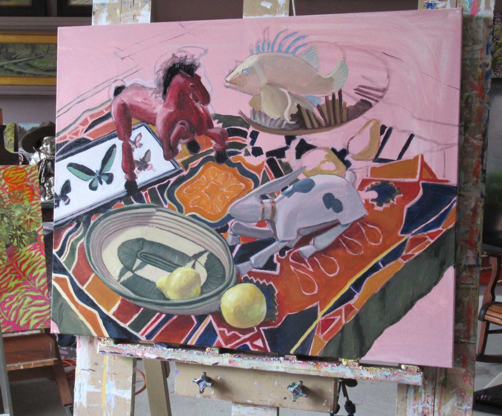 It was a good day to hunker down in the studio and work on things. I think I like painting this vintage scarf more than I’d like wearing it. The shapes and colors are rather unusual — and that intrigues me. I finally had to quit when things got too gooey. And I worked all day with just 1 brush: a #4 flat by Silver Brush Company. I like its sharp, chisled edge. Frayed-out brushes — eeeek!