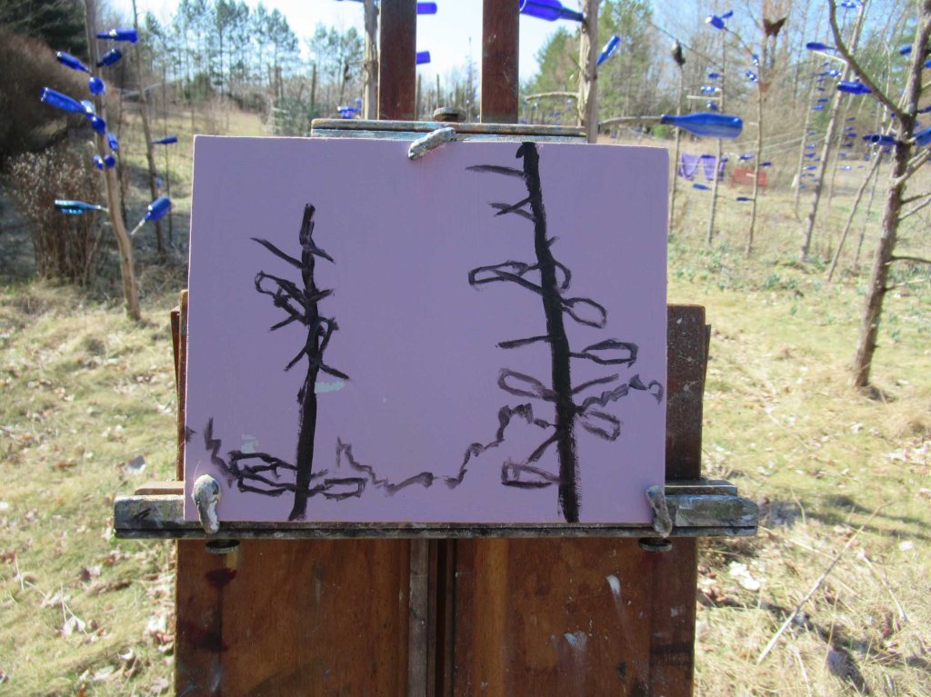 We only got 90% totality here in northern Michigan, but still — I knew I’d never forgive myself if I didn’t at least try to paint it. This morning I set up my easel in the front yard and drew in the basic design. I had no idea how dark it might get, so I figured I should at least have something to work with if things turned pretty dark. Here’s what I put down at 10 AM (below). Then I went into the studio to work on my still life for a few hours.