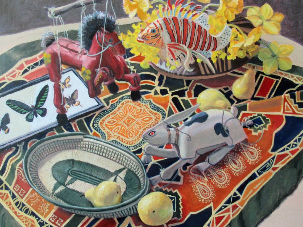 I’m calling this “done”. The initial inspiration for this came from the vintage silk scarf I’d found at Wilson’s Antiques. The horse puppet was from an estate sale and I’d had it hanging in my house. My dearly-departed friend, Hannah Frassinelli, gave me the bunny puppet a few years ago. Actually, everything’s from various estate sales and junk stores.