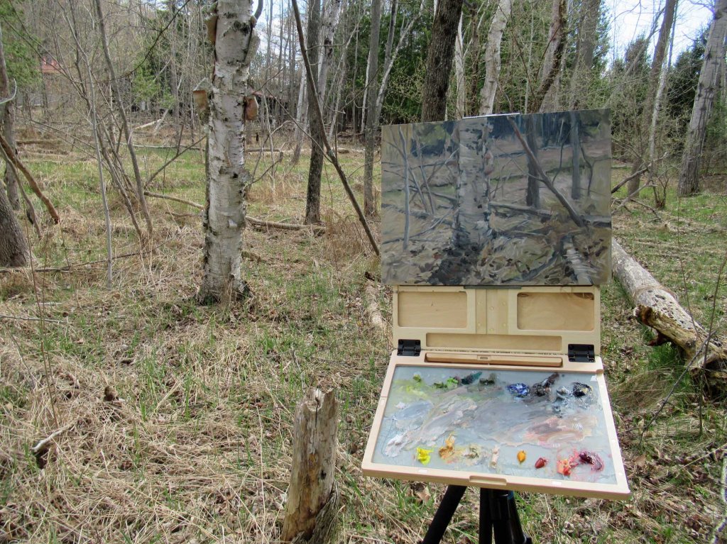 This morning was gloomy and chilly, so I stayed in the studio, funk-ifying a painting I’d done of one of my cats. And then the sun came out! Blue skies! It was even “warm-ish”! I ran upstairs and dug out a pair of my tick-proof pants and lugged my painting gear across one of my bridges to set up and paint this beautiful birch tree. A pileated woodpecker was busy chiseling out a nest as I painted. As I was finishing this, clouds blew back in and the wind grew chilly. OK — I’m done with this!