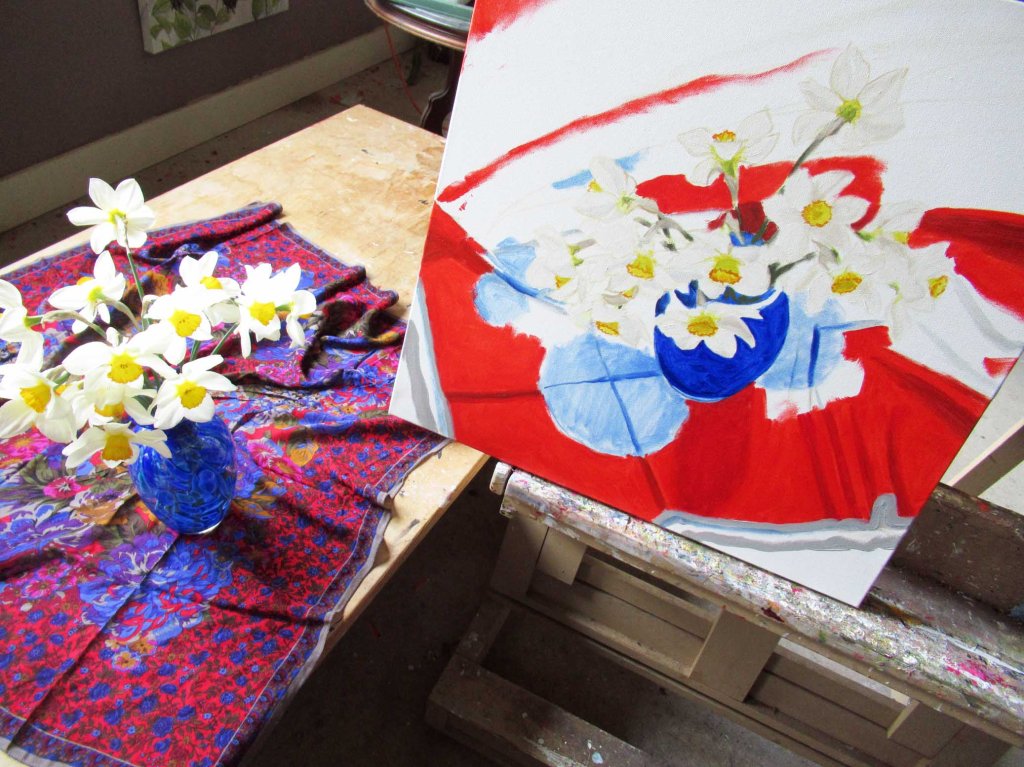 It was a gorgeous day and the last thing I’d planned to do was to stay in the studio! But I’d found another really cool scarf. And the “late” daffodils will be finished in a few days. I hated to waste them, so I started just one more painting.