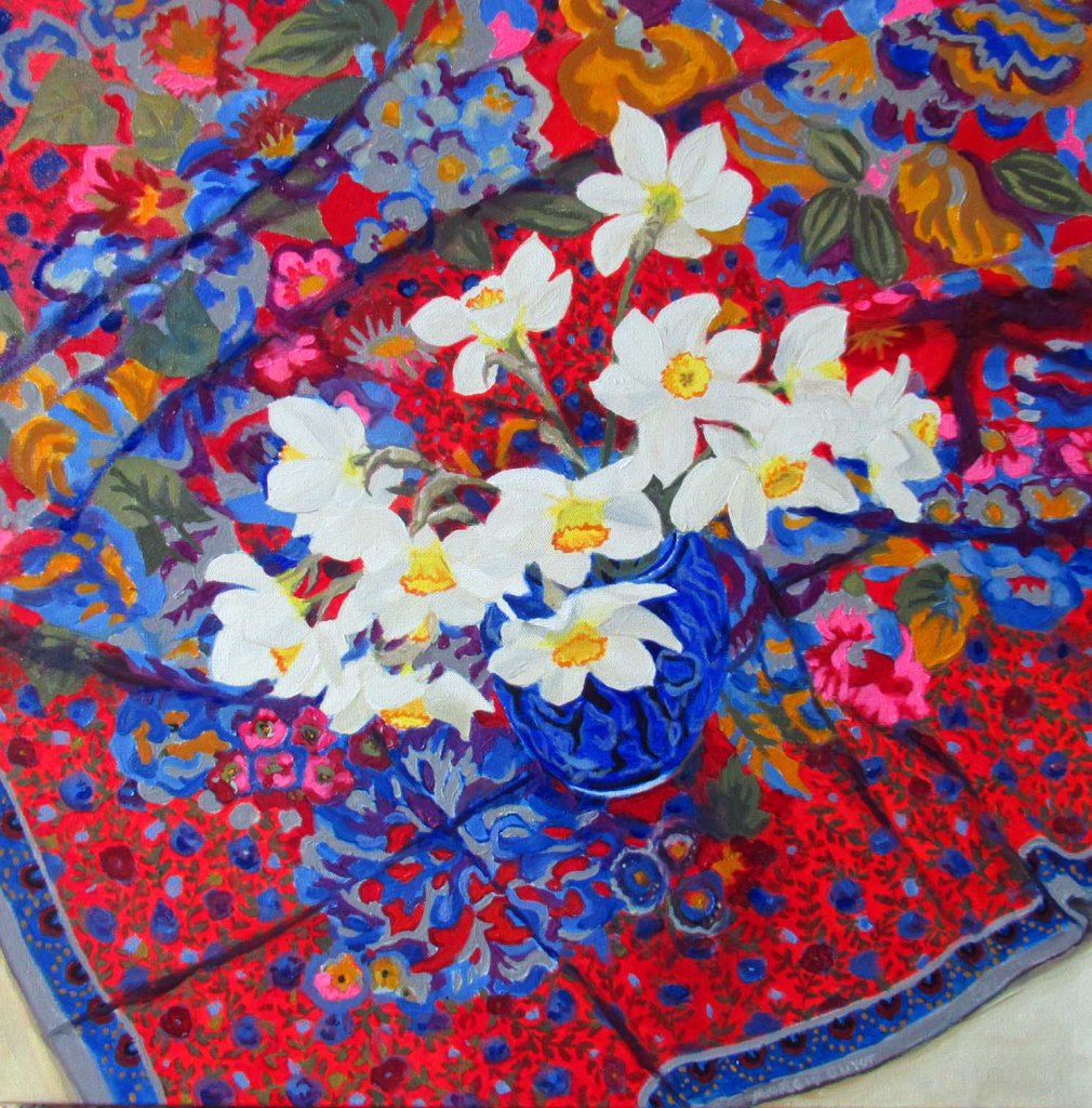 I’m keeping the title simple, although when I look at this, I’m thinking “Daffodils on a Crazy-Maker Scarf”. I gathered these daffodils from a clump out in the swamp. They’re some of the last to bloom. I felt it would somehow be tragic not to paint them. And I let everything else go to hell while I painted. You can’t count on flowers (especially daffodils) to hold up for 4 or 5 days, so I let things fly. Just you watch — they’ll probably still be looking good through the weekend.