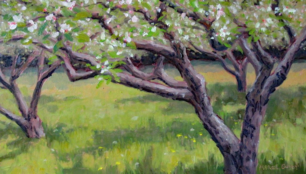 The snow melts, the skies turn blue — and all of a sudden it’s everything, everywhere, all at once — yardwork, gardening, schlepping paintings to galleries, etc. Today I decided I MUST get out to paint. And where did I go? Nowhere. Just stayed in my own backyard. I’ve always enjoyed this view but hadn’t gotten around to painting it. Another advantage: my dear cat, Picasso, could hang out with me and give little meows of encouragement. Here he is, supervising: