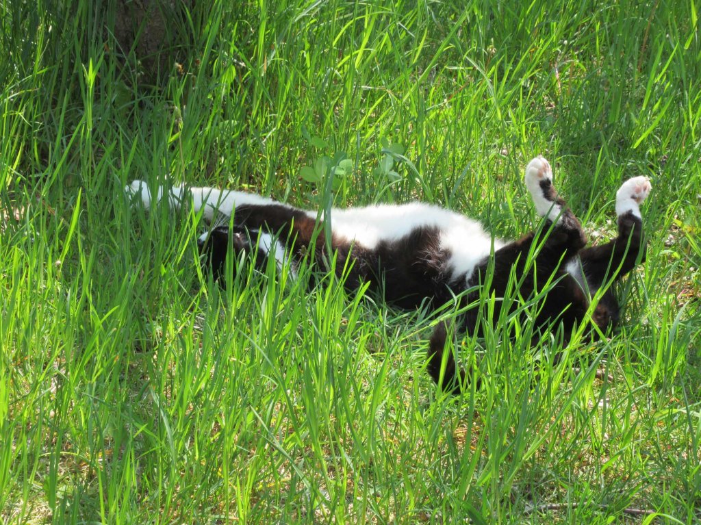 The “basic blobs” of color were relatively quick and easy. Plus there’s the added advantage of seeing more of the blank surface “covered”. As opposed to the empty chasm of emptiness, glaring back, taunting, paint something, you old fool! Then it was on to facing those tree trunks and time just flew by — too quickly for me to remember to photograph that struggle. I appreciated Picasso being there for moral support. It helps to stop now and then, turn, and rub a purring cat’s belly….