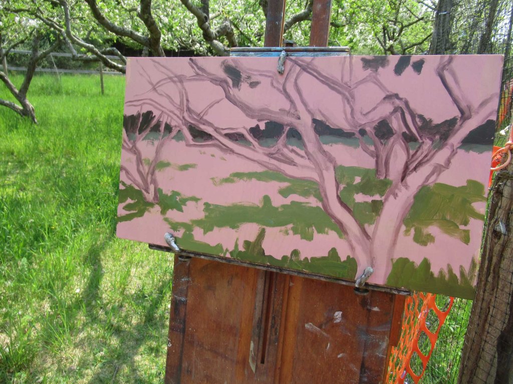 Usually paintings always look pretty rough in the beginning. Rough, as in “pretty awful”. Here’s stage 1. I’ve found it’s worthwhile to try and get the drawing right from the very beginning: