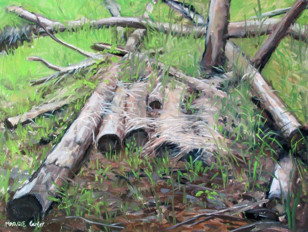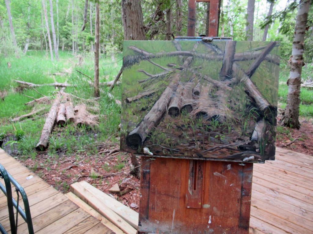 What else to do on a chilly, cloudy day? I’d been eyeing this pile of logs for over a year. This is right along the little creek that runs through my property. Things are starting to green up. Jack-in-the-pulpits are popping up. Marsh marigolds are blooming. Birdies singing. But it was so chilly I had to set my brush down and go put on a sweatshirt. Even my most loyal cat, Picasso, who usually supervises my every move, gave up and came over and pawed my leg. “This is ridiculous! Let me in the house, Mom!” So while my 3 spoiled cats snoozed on my bed, I persisted and painted logs. Plenty of them in the swamp here, thanks to the emerald ash borer. So there will always be plenty of things to paint.