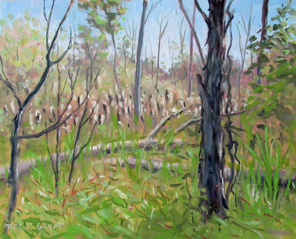 I started a series – the Swamp Series – last winter, so here’s the Spring edition. Notice the cattails in the background. They appear in all seasons, some the worse for wear. Young green leaves are shooting up now and the old, grizzled “cats” are slowly disintigrating. All of these paintings were done on Brant Road, off Old Dixie Highway, just south of Norwood. I painted this several days ago, after working “like a dawg!” in my yard. Just now getting around to posting.