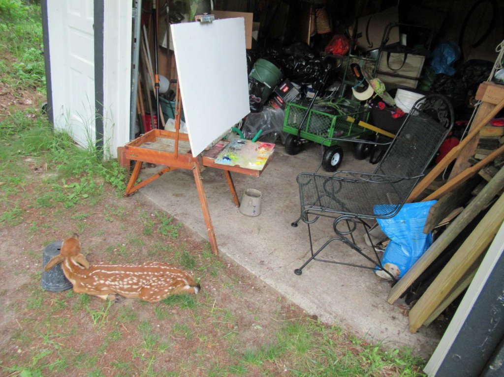 A week or so ago I picked up a roadkill fawn and did a painting study of it, thinking maybe I’d want to do a painting to fit a really cool Facebook Marketplace frame I’d bought. It was a rainy day, so I set up my easel in the garage. Propped up the fawn’s head with a flowerpot. Here’s my setup: