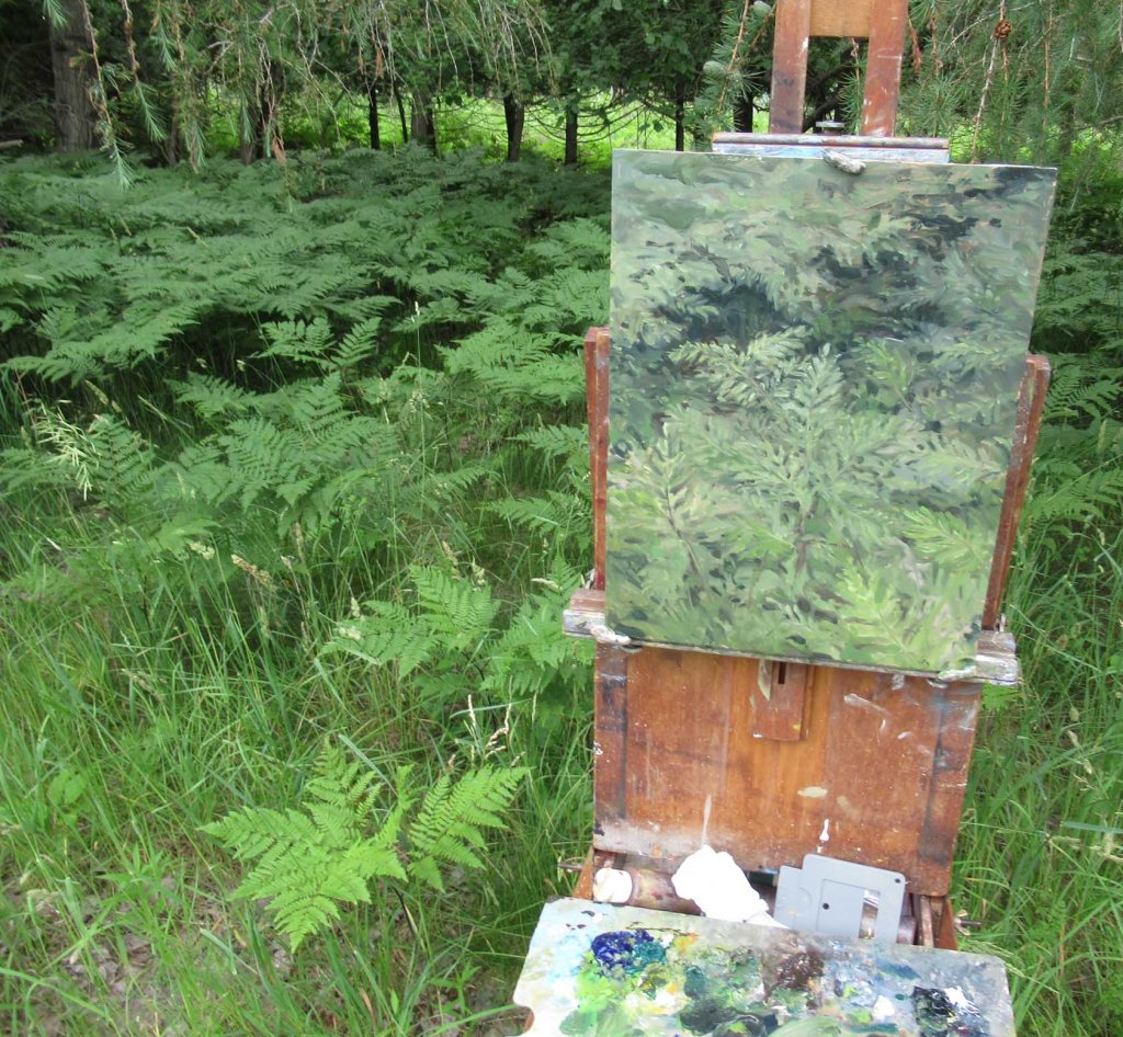 The other day I set up my easel along the driveway and tried my hand at painting bracken. It was one of those days where I really wanted to plein air paint — but didn’t want to actually GO anywhere. I’d never tried painting bracken before. Didn’t know if I could make a halfway decent painting out of it. Here’s my setup: