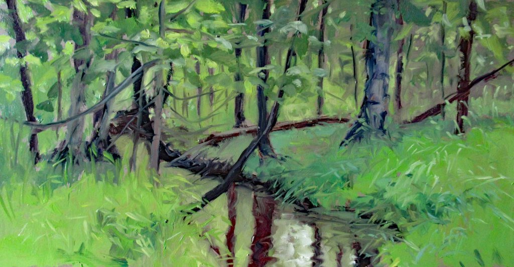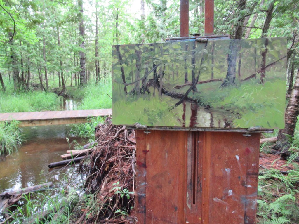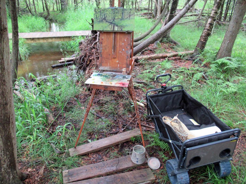 The rain held off just long enough for me to paint this today. Guyer Creek twists and turns and runs all through my property. It’s what sold me on this house. I love painting it in all times of the year. Today I had to lay down some old boards to stand on — or I’d have sunk into the mud. See my setup below: