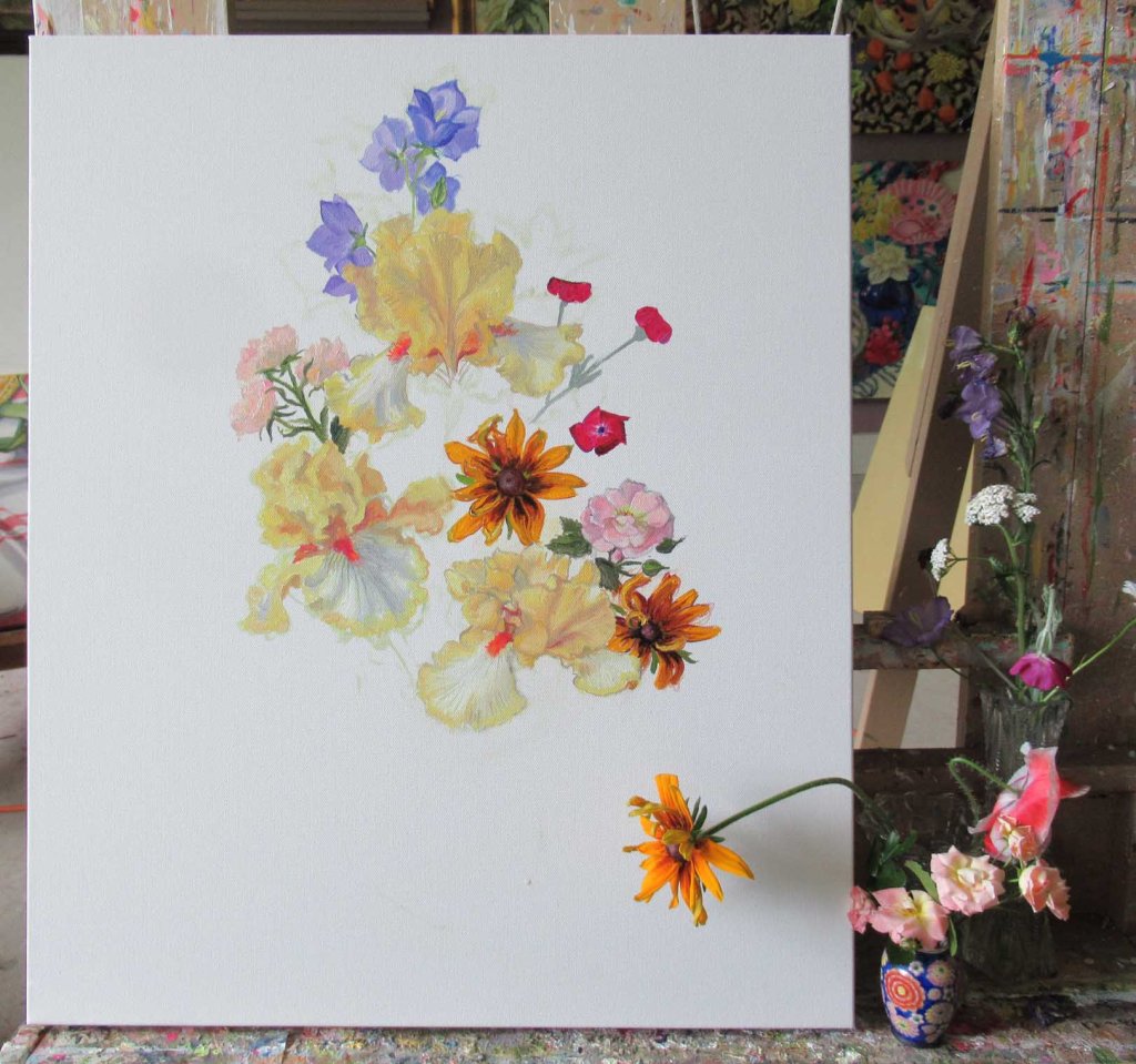 It’s been one of those absolutely crazy weeks, driving all over, schlepping paintings hither and yon. The galleries want more 6×6″ iris paintings. But it’s the end of iris season here. The other day I picked my very last iris and did a 6×6″. Then I thought why not do a larger painting? So each day I’ve been wandering out into the yard, looking for possibilities. I’ve only had an hour or two each day to work. Years ago when I was laid off Ford Motor Company’s Wixom Assembly plant (for 4 long years!), I worked as a floral arranger in a shop down in Detroit, so I feel confident about being able to throw together something that looks good. That gloriosa daisy was the first one to open in my yard, so I grabbed it. Let’s see what tomorrow brings…..
