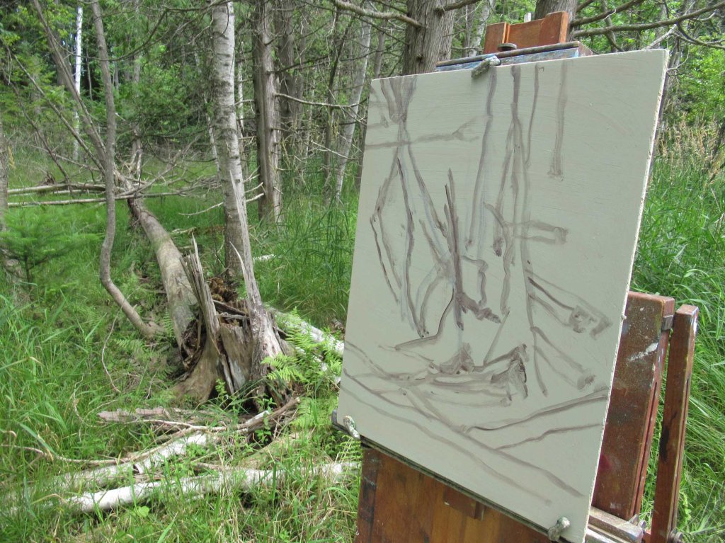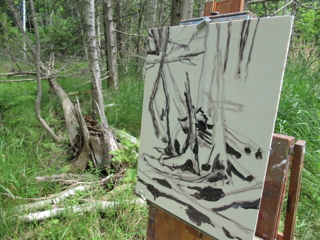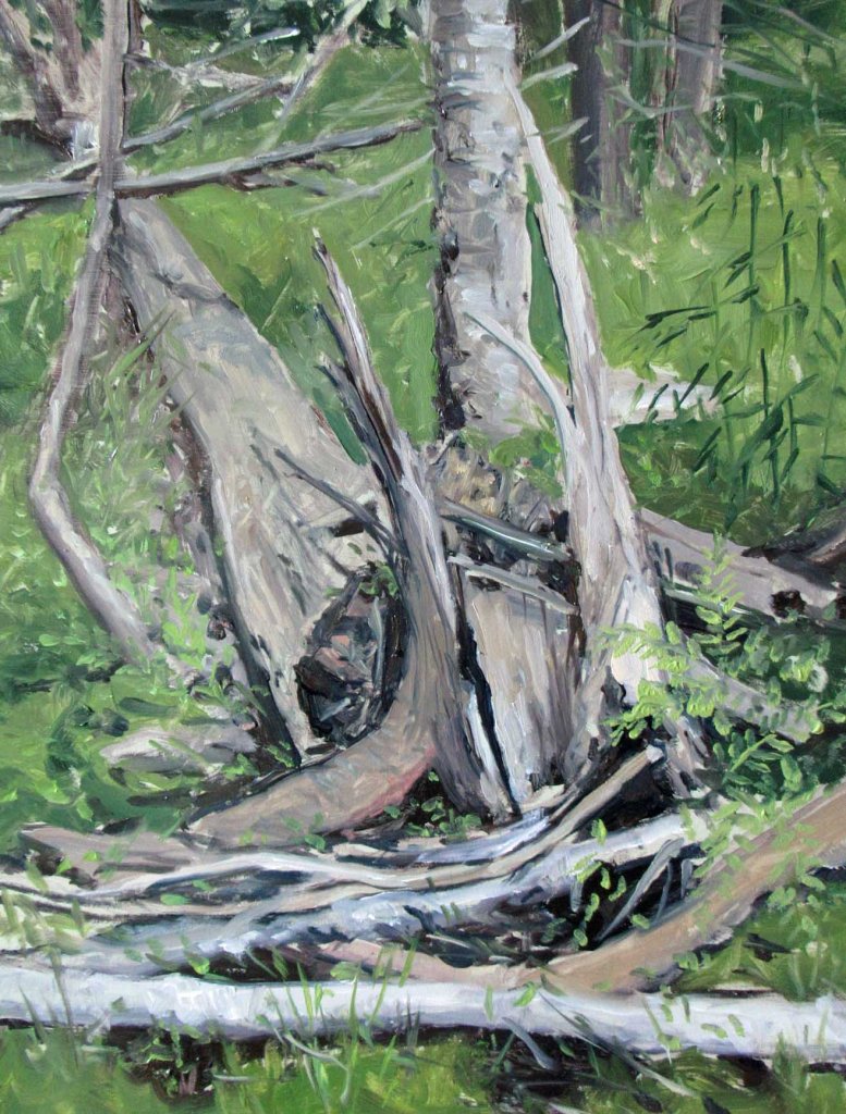 I suppose instead of filling in the fallen tree colors, I could have painted in the green grass areas. Sometimes I alternate blocking in large areas.