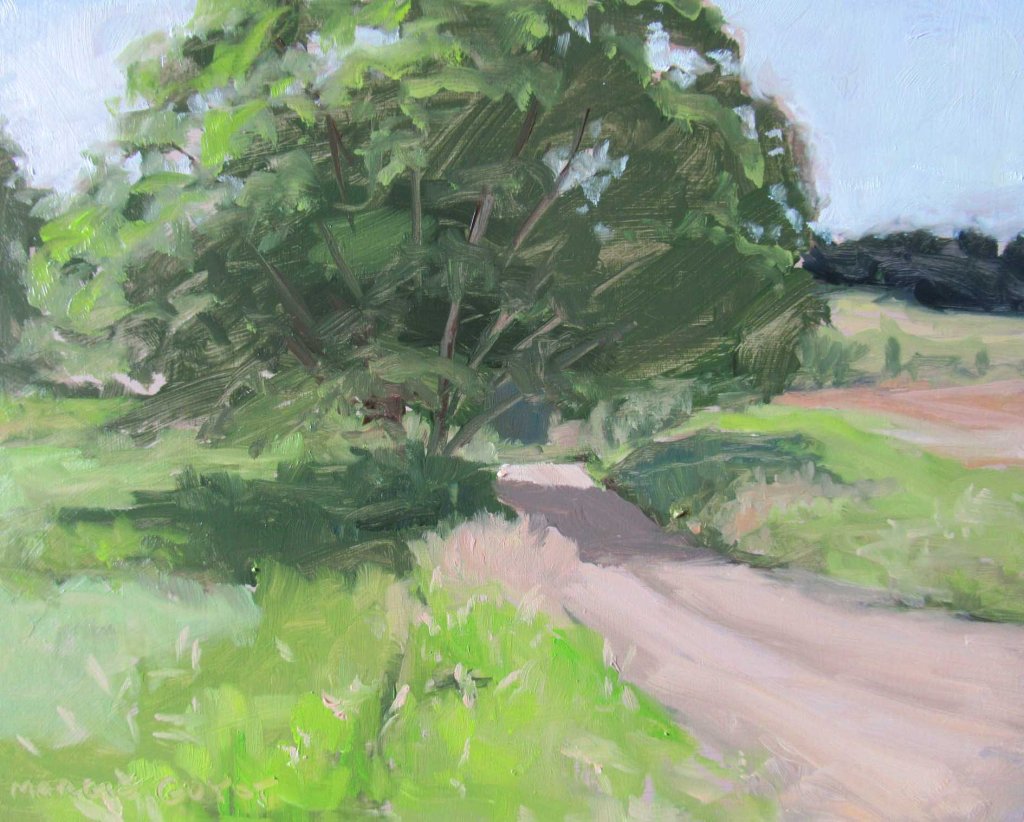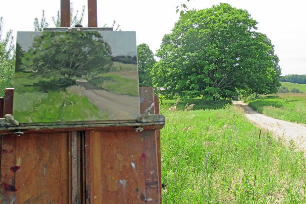 Slough Road, east of Ellsworth, is a beautiful road. I’ve found some great spots to paint there. Except in rainy weather or snow — then you do NOT want to be on that road! Total quagmire, even with 4WD low. This afternoon I was looking for a nice, shady spot to stand under while painting. Right at the corner of Slough and Boss, I found it. Although I was at the mercy of clouds of dust when people drove by.
