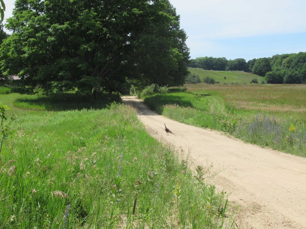 I almost called this post “Painting With Turkeys”. A rather confused-looking hen turkey came wandering out of the field and strolled around in loops for a while.
